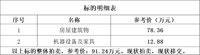 以上標(biāo)的整體拍賣,參考價(jià):91.24萬元。現(xiàn)狀拍賣,現(xiàn)狀移交。保證金:10萬元。標(biāo)的詳情見中拍平臺(tái)附件《標(biāo)的明細(xì)表》。