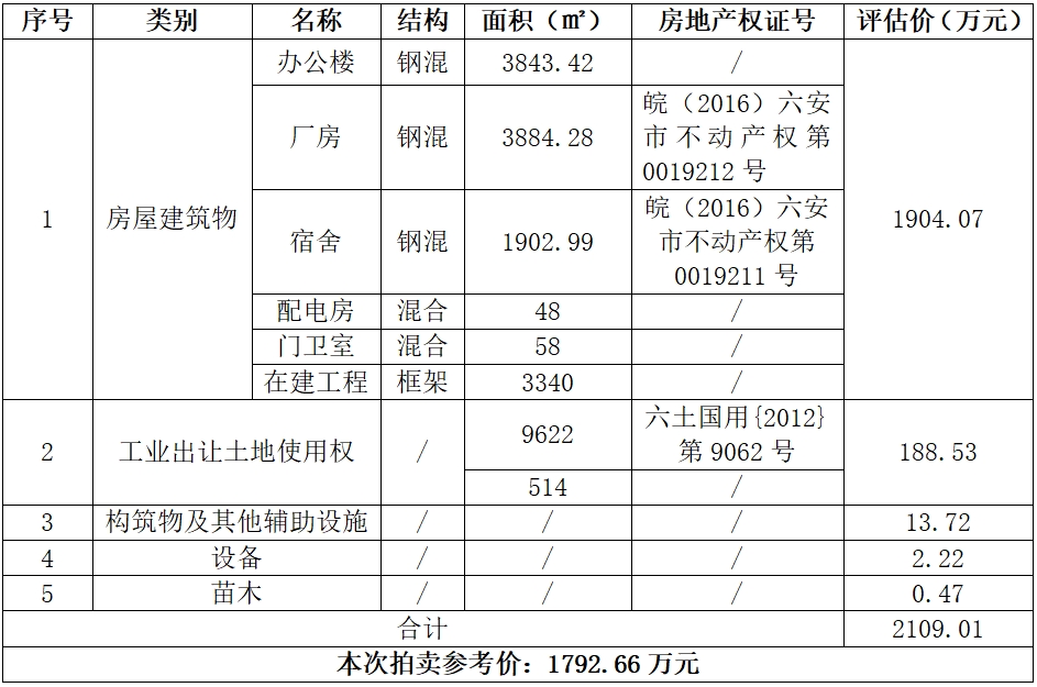 1.原六安市華宏印花有限公司所有的辦公樓、廠房、宿舍等房產(chǎn),總面積約13076.69㎡。其中宿舍樓和廠房有產(chǎn)權(quán)證;