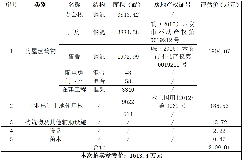 1.原六安市華宏印花有限公司所有的辦公樓、廠房、宿舍等房產(chǎn),總面積約13076.69㎡。其中宿舍樓和廠房有產(chǎn)權(quán)證。