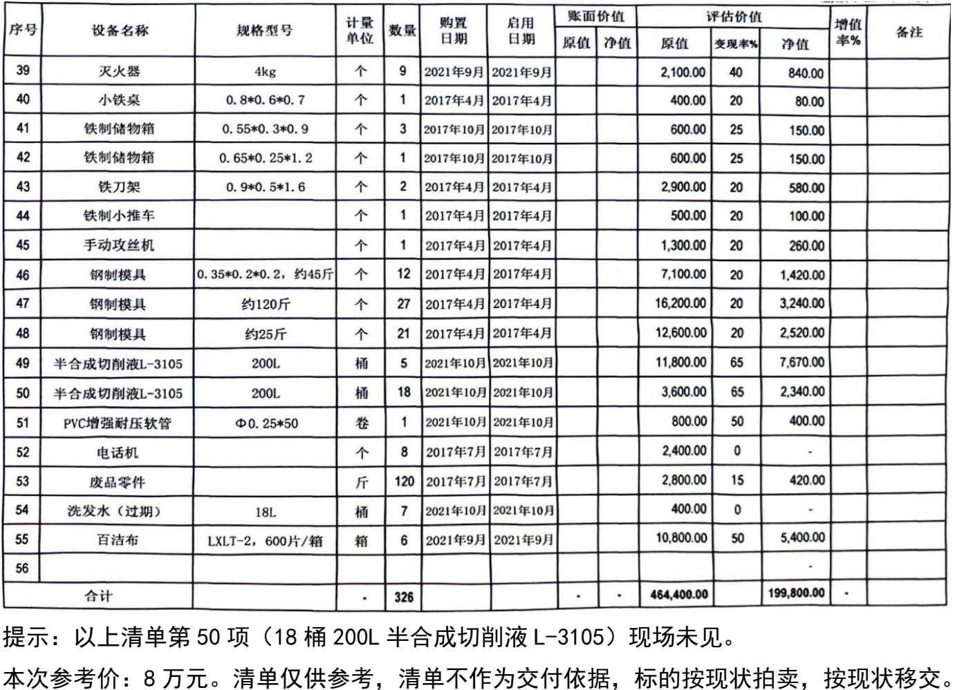特別提示:由于標(biāo)的是廢舊物品,可能存在部件損失、不全以及規(guī)格型號不匹配等情況,現(xiàn)場數(shù)量與清單可能有差異,清單不作為交付依據(jù),以實物看樣為準(zhǔn),以現(xiàn)場實物移交。