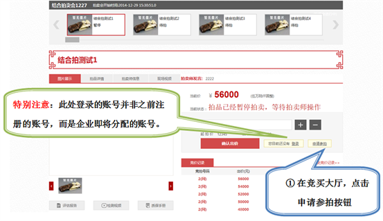 如果在點(diǎn)擊拍賣會(huì)后直接進(jìn)入如下頁面,說明此拍賣會(huì)游客不可進(jìn)入。點(diǎn)擊申請(qǐng)參拍后,使用企業(yè)分配的賬號(hào)進(jìn)入拍賣會(huì)。