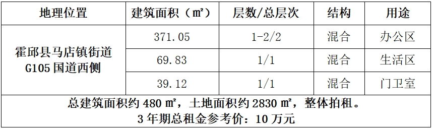 一、拍租標(biāo)的:位于霍邱縣馬店鎮(zhèn)街道G105國(guó)道西側(cè)的霍邱縣公安局交通管理大隊(duì)馬店中隊(duì)辦公用房3年期租賃權(quán),3年期總租金參考價(jià):10萬元,成交后,競(jìng)得人與委托方簽訂3年期房屋租賃合同。標(biāo)的詳情見下表: