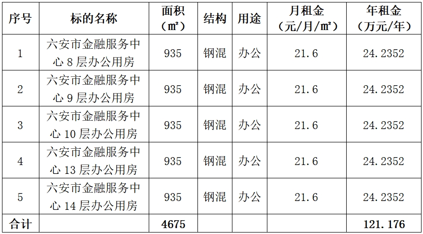 一、拍租標(biāo)的:六安市金融服務(wù)中心8-10層、13-14層已裝修辦公用房3年期租賃權(quán),拍租標(biāo)的位于六安市金裕大道與燕山路交叉口東北角,可單層出租,也可多層出租。每層租金參考價(jià):24.2352萬元/年,合同期內(nèi)年租金無遞增。標(biāo)的詳情見下方標(biāo)的明細(xì)表: