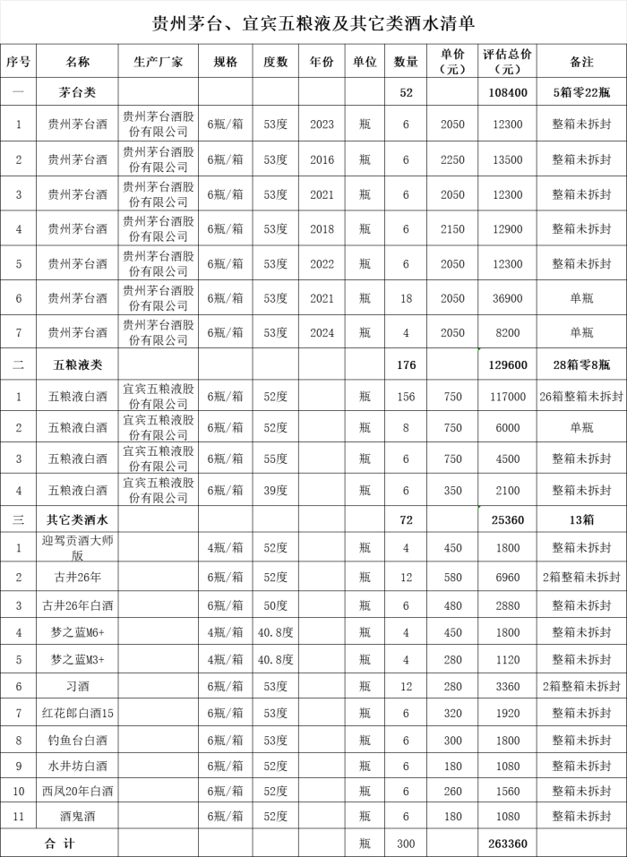 一、拍賣標(biāo)的:茅臺(tái)酒計(jì)52瓶、五糧液計(jì)176瓶及其它類酒水計(jì)72瓶,整體打包拍賣,參考價(jià):26.336萬(wàn)元,競(jìng)買保證金:2萬(wàn)元。標(biāo)的詳見(jiàn)下方清單: