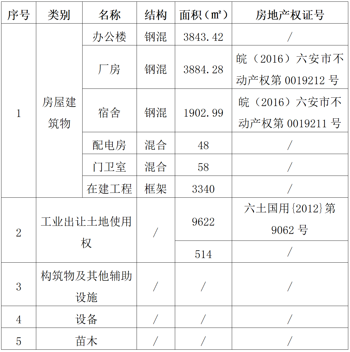 1.原六安市華宏印花有限公司所有的辦公樓、廠房、宿舍等房產(chǎn),總面積約13076.69㎡。其中宿舍樓和廠房有產(chǎn)權證。