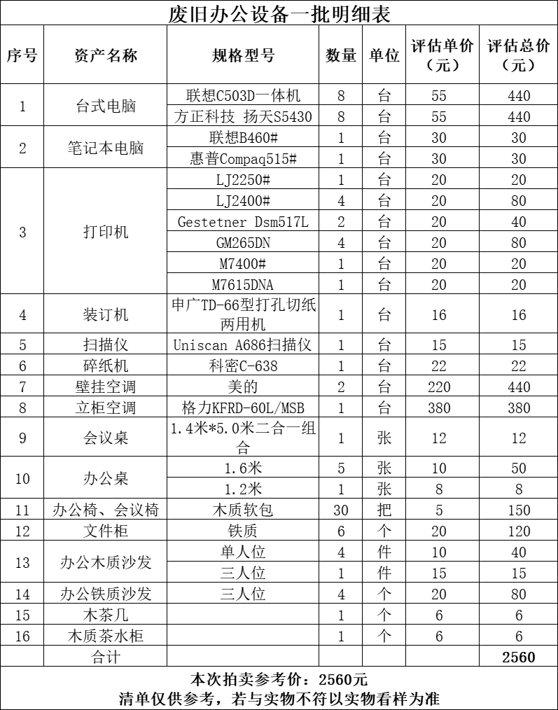 2、廢舊辦公設(shè)備一批,包括空調(diào)、電腦、打印機(jī)、文件柜等,參考價:2560元,保證金:1000元。