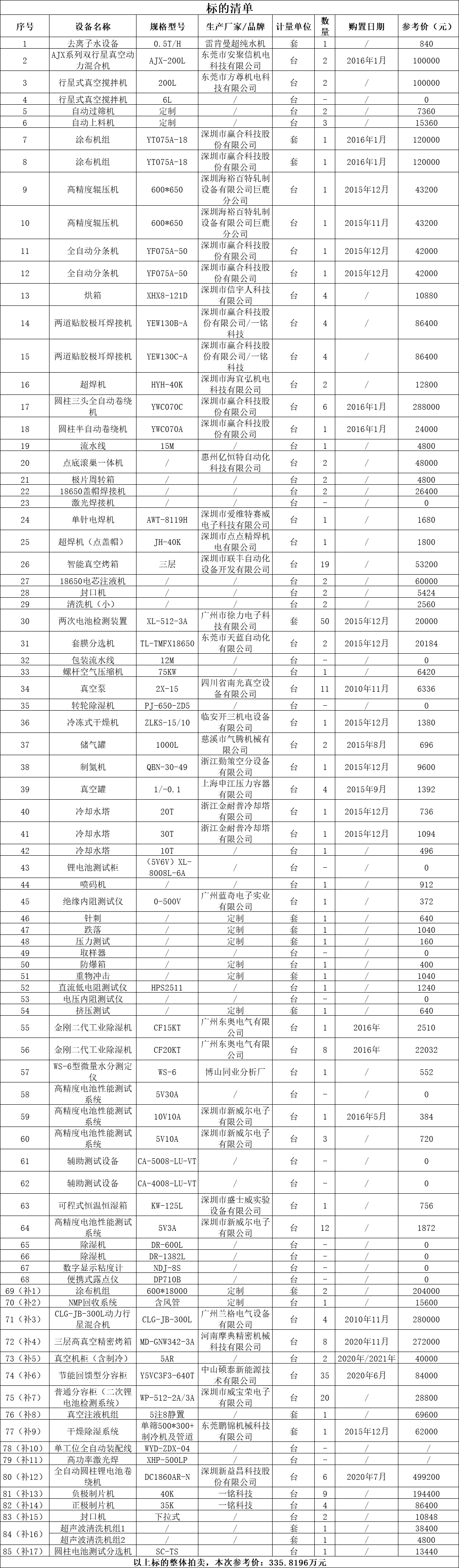 一、拍賣標(biāo)的:全自動(dòng)圓柱鋰電池卷繞機(jī)、正負(fù)制片機(jī)、AJX系列雙行星真空動(dòng)力混合機(jī)、圓柱三頭全自動(dòng)卷繞機(jī)、行星式真空攪拌機(jī)、涂布機(jī)組等二手設(shè)備一批,整體拍賣,參考價(jià):335.8196萬(wàn)元。競(jìng)買保證金:50萬(wàn)元。