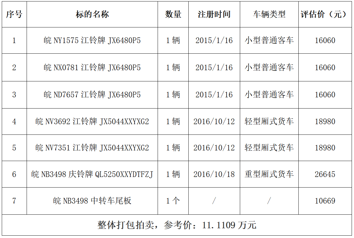 一、拍賣(mài)標(biāo)的:皖NY1575、皖NX0781江鈴牌等二手車(chē)6輛及中轉(zhuǎn)車(chē)尾板,整體打包拍賣(mài),參考價(jià):11.1109萬(wàn)元。競(jìng)買(mǎi)保證金1萬(wàn)元。標(biāo)的詳情見(jiàn)下方清單: