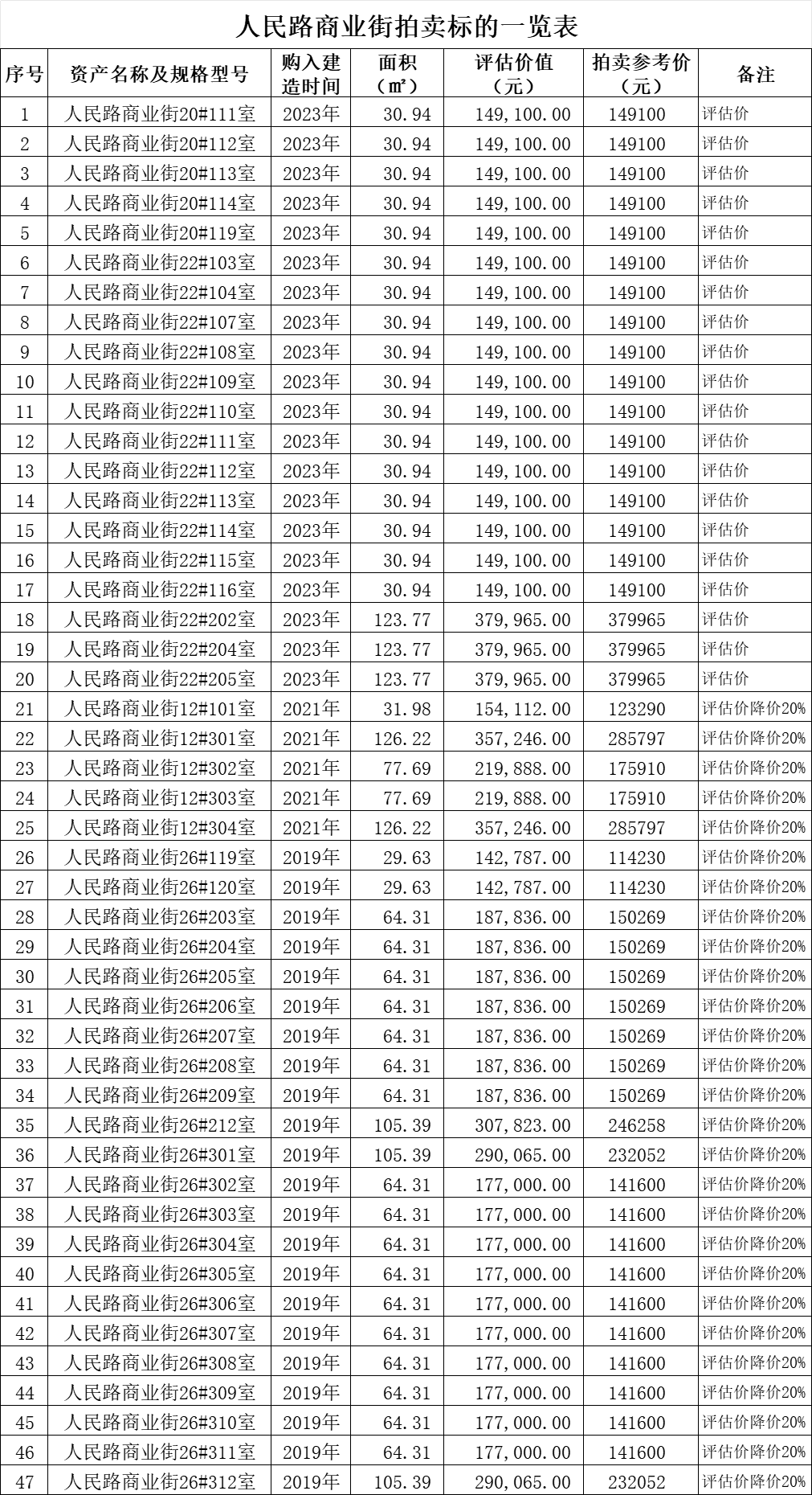 2、2025年1月15日15時30分拍賣:佛子嶺鎮(zhèn)人民路商業(yè)街房產(chǎn)47套,總建筑面積約2806平方米,土地性質(zhì)為國有劃撥土地,本次拍賣不含土地。(詳情及拍賣參考價等見下方附表↓)