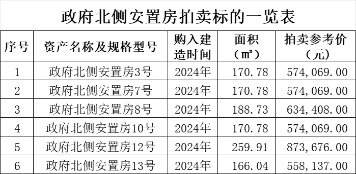 3、2025年1月15日16時拍賣:佛子嶺鎮(zhèn)政府北側(cè)安置房6套,總建筑面積約1127平方米,土地性質(zhì)為國有劃撥土地,本次拍賣不含土地。(詳情及拍賣拍賣參考價等見下方附表↓)