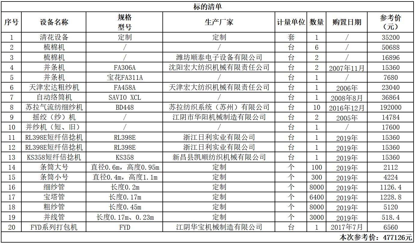 一、拍賣標的:二手紡織設備一批,包括清花設備、自動絡筒機、梳棉機、并條機、粗紗機、細紗機等。以上標的整體拍賣,參考價:47.7126萬元,F狀拍賣,現狀移交。競買保證金:10萬元。