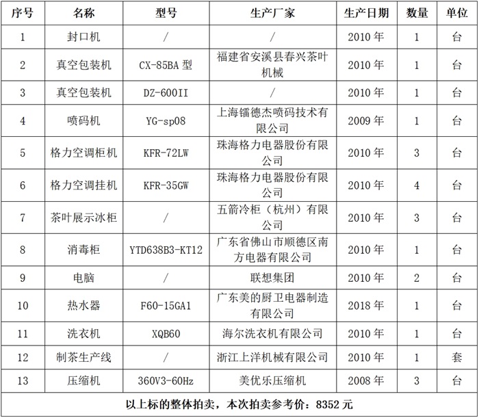 一、拍賣標的:制茶生產(chǎn)線、壓縮機等報廢生產(chǎn)設備及空調等廢舊物資一批,打包拍賣,參考價:8352元,競買保證金:3000元。