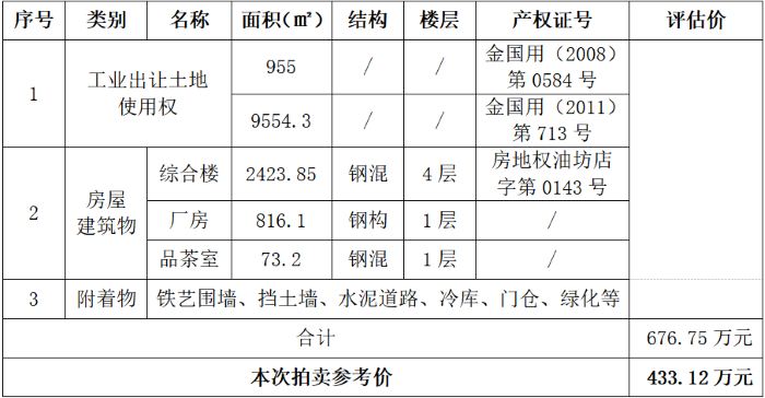 一、拍賣標(biāo)的:六安市金寨縣油坊店鄉(xiāng)朱堂村“安徽齊山六安瓜片股份有限公司”工業(yè)用地及房屋建筑物、附著物等,包括