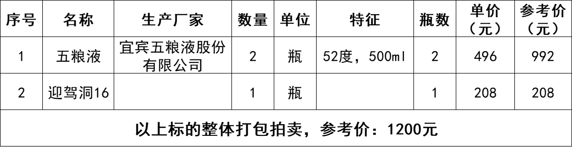 2、五糧液酒2瓶、迎駕洞藏16酒1瓶,整體打包拍賣,參考價(jià):1200元,競(jìng)買保證金:1000元。標(biāo)的詳情見下方清單: