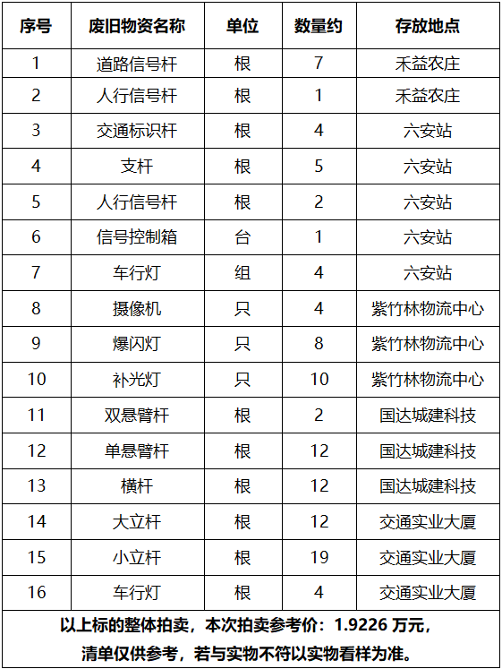 一、拍賣(mài)標(biāo)的:廢舊物資一批,包括道路信號(hào)桿、人行信號(hào)桿、交通標(biāo)識(shí)桿、大立桿、小立桿、單懸臂桿、雙懸臂桿等,參考價(jià):1.9226萬(wàn)元。競(jìng)買(mǎi)保證金:1萬(wàn)元。